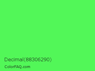 Decimal 88306290 Color is a light green color and the nearest color is Screamin Green #66ff66. Hex code #52f758 and RGB value is rgb(82,247,88). In RGB color space, this color is composed of 32% red, 97% green, 35% blue, In CMYK color space, this color is composed of 67% cyan, 0% magenta, 64% yellow , 3% black , In HSL color space, this color has a hue angle of 122° , 91% saturation and 65% lightness.