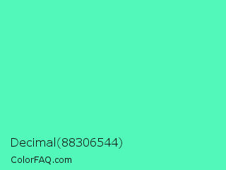 Decimal 88306544 Color is a light green color and the nearest color is Medium Aquamarine #66ddaa. Hex code #52f7ba and RGB value is rgb(82,247,186). In RGB color space, this color is composed of 32% red, 97% green, 73% blue, In CMYK color space, this color is composed of 67% cyan, 0% magenta, 25% yellow , 3% black , In HSL color space, this color has a hue angle of 158° , 91% saturation and 65% lightness.