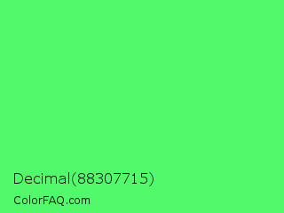 Decimal 88307715 Color is a light green color and the nearest color is Screamin Green #66ff66. Hex code #52f96b and RGB value is rgb(82,249,107). In RGB color space, this color is composed of 32% red, 98% green, 42% blue, In CMYK color space, this color is composed of 67% cyan, 0% magenta, 57% yellow , 2% black , In HSL color space, this color has a hue angle of 129° , 93% saturation and 65% lightness.