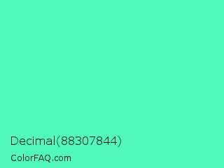 Decimal 88307844 Color is a light green color and the nearest color is Turquoise #40e0d0. Hex code #52f9bc and RGB value is rgb(82,249,188). In RGB color space, this color is composed of 32% red, 98% green, 74% blue, In CMYK color space, this color is composed of 67% cyan, 0% magenta, 24% yellow , 2% black , In HSL color space, this color has a hue angle of 158° , 93% saturation and 65% lightness.