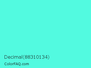 Decimal 88310134 Color is a light cyan color and the nearest color is Turquoise #40e0d0. Hex code #52fae0 and RGB value is rgb(82,250,224). In RGB color space, this color is composed of 32% red, 98% green, 88% blue, In CMYK color space, this color is composed of 67% cyan, 0% magenta, 10% yellow , 2% black , In HSL color space, this color has a hue angle of 171° , 94% saturation and 65% lightness.