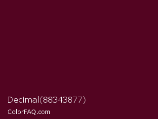 Decimal 88343877 Color is a very dark rose color and the nearest color is Castro #52001f. Hex code #530421 and RGB value is rgb(83,4,33). In RGB color space, this color is composed of 33% red, 2% green, 13% blue, In CMYK color space, this color is composed of 0% cyan, 95% magenta, 60% yellow , 67% black , In HSL color space, this color has a hue angle of 338° , 91% saturation and 17% lightness.