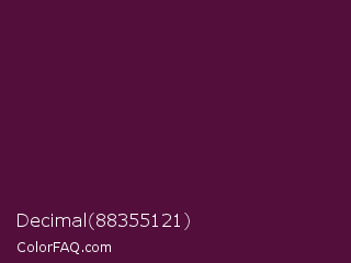 Decimal 88355121 Color is a very dark magenta color and the nearest color is Mulberry Wood #5c0536. Hex code #530e3b and RGB value is rgb(83,14,59). In RGB color space, this color is composed of 33% red, 5% green, 23% blue, In CMYK color space, this color is composed of 0% cyan, 83% magenta, 29% yellow , 67% black , In HSL color space, this color has a hue angle of 321° , 71% saturation and 19% lightness.