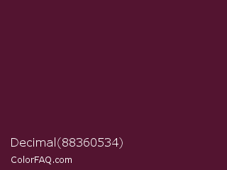 Decimal 88360534 Color is a very dark rose color and the nearest color is Wine Berry #591d35. Hex code #531430 and RGB value is rgb(83,20,48). In RGB color space, this color is composed of 33% red, 8% green, 19% blue, In CMYK color space, this color is composed of 0% cyan, 76% magenta, 42% yellow , 67% black , In HSL color space, this color has a hue angle of 333° , 61% saturation and 20% lightness.