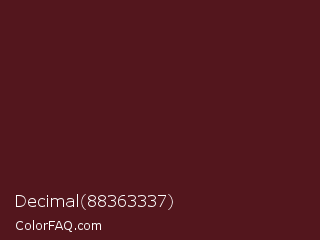 Decimal 88363337 Color is a very dark red color and the nearest color is Maroon Oak #520c17. Hex code #53161d and RGB value is rgb(83,22,29). In RGB color space, this color is composed of 33% red, 9% green, 11% blue, In CMYK color space, this color is composed of 0% cyan, 73% magenta, 65% yellow , 67% black , In HSL color space, this color has a hue angle of 353° , 58% saturation and 21% lightness.