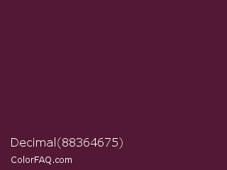 Decimal 88364675 Color is a very dark rose color and the nearest color is Wine Berry #591d35. Hex code #531833 and RGB value is rgb(83,24,51). In RGB color space, this color is composed of 33% red, 9% green, 20% blue, In CMYK color space, this color is composed of 0% cyan, 71% magenta, 39% yellow , 67% black , In HSL color space, this color has a hue angle of 333° , 55% saturation and 21% lightness.