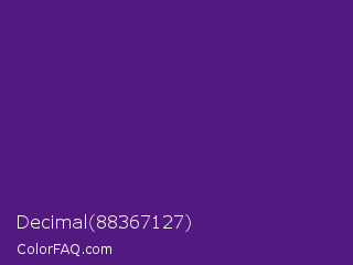Decimal 88367127 Color is a dark purple color and the nearest color is Spanish Violet #4c2882. Hex code #531981 and RGB value is rgb(83,25,129). In RGB color space, this color is composed of 33% red, 10% green, 51% blue, In CMYK color space, this color is composed of 36% cyan, 81% magenta, 0% yellow , 49% black , In HSL color space, this color has a hue angle of 273° , 68% saturation and 30% lightness.