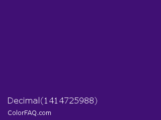 Decimal 1414725988 Color is a dark violet color and the nearest color is Windsor #3c0878. Hex code #401074 and RGB value is rgb(64,16,116). In RGB color space, this color is composed of 25% red, 6% green, 45% blue, In CMYK color space, this color is composed of 45% cyan, 86% magenta, 0% yellow , 55% black , In HSL color space, this color has a hue angle of 269° , 76% saturation and 26% lightness.