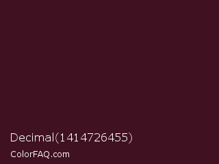 Decimal 1414726455 Color is a very dark rose color and the nearest color is Dark Sienna #3c1414. Hex code #401121 and RGB value is rgb(64,17,33). In RGB color space, this color is composed of 25% red, 7% green, 13% blue, In CMYK color space, this color is composed of 0% cyan, 73% magenta, 48% yellow , 75% black , In HSL color space, this color has a hue angle of 340° , 58% saturation and 16% lightness.