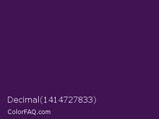 Decimal 1414727833 Color is a very dark purple color and the nearest color is Deep Grape #381a51. Hex code #401353 and RGB value is rgb(64,19,83). In RGB color space, this color is composed of 25% red, 7% green, 33% blue, In CMYK color space, this color is composed of 23% cyan, 77% magenta, 0% yellow , 67% black , In HSL color space, this color has a hue angle of 282° , 63% saturation and 20% lightness.