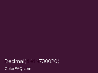 Decimal 1414730020 Color is a very dark magenta color and the nearest color is Dark Purple #301934. Hex code #401434 and RGB value is rgb(64,20,52). In RGB color space, this color is composed of 25% red, 8% green, 20% blue, In CMYK color space, this color is composed of 0% cyan, 69% magenta, 19% yellow , 75% black , In HSL color space, this color has a hue angle of 316° , 52% saturation and 16% lightness.