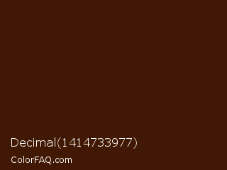 Decimal 1414733977 Color is a very dark orange color and the nearest color is Brown Pod #401801. Hex code #401803 and RGB value is rgb(64,24,3). In RGB color space, this color is composed of 25% red, 9% green, 1% blue, In CMYK color space, this color is composed of 0% cyan, 63% magenta, 95% yellow , 75% black , In HSL color space, this color has a hue angle of 21° , 91% saturation and 13% lightness.