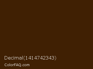 Decimal 1414742343 Color is a very dark orange color and the nearest color is Dark Ebony #3c2005. Hex code #402003 and RGB value is rgb(64,32,3). In RGB color space, this color is composed of 25% red, 13% green, 1% blue, In CMYK color space, this color is composed of 0% cyan, 50% magenta, 95% yellow , 75% black , In HSL color space, this color has a hue angle of 29° , 91% saturation and 13% lightness.
