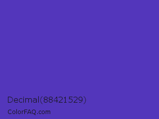 Decimal 88421529 Color is a normal indigo color and the nearest color is Ocean Blue #4f42b5. Hex code #5336bb and RGB value is rgb(83,54,187). In RGB color space, this color is composed of 33% red, 21% green, 73% blue, In CMYK color space, this color is composed of 56% cyan, 71% magenta, 0% yellow , 27% black , In HSL color space, this color has a hue angle of 253° , 55% saturation and 47% lightness.