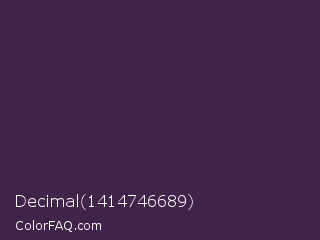 Decimal 1414746689 Color is a very dark purple color and the nearest color is Deep Grape #381a51. Hex code #402449 and RGB value is rgb(64,36,73). In RGB color space, this color is composed of 25% red, 14% green, 29% blue, In CMYK color space, this color is composed of 12% cyan, 51% magenta, 0% yellow , 71% black , In HSL color space, this color has a hue angle of 285° , 34% saturation and 21% lightness.