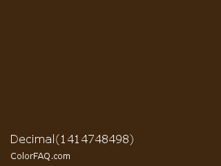 Decimal 1414748498 Color is a very dark orange color and the nearest color is Deep Oak #412010. Hex code #402710 and RGB value is rgb(64,39,16). In RGB color space, this color is composed of 25% red, 15% green, 6% blue, In CMYK color space, this color is composed of 0% cyan, 39% magenta, 75% yellow , 75% black , In HSL color space, this color has a hue angle of 29° , 60% saturation and 16% lightness.