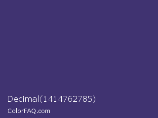 Decimal 1414762785 Color is a normal indigo color and the nearest color is Jacarta #3a2a6a. Hex code #403371 and RGB value is rgb(64,51,113). In RGB color space, this color is composed of 25% red, 20% green, 44% blue, In CMYK color space, this color is composed of 43% cyan, 55% magenta, 0% yellow , 56% black , In HSL color space, this color has a hue angle of 253° , 38% saturation and 32% lightness.