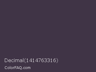 Decimal 1414763316 Color is a dark purple color and the nearest color is Ship Gray #3e3a44. Hex code #403446 and RGB value is rgb(64,52,70). In RGB color space, this color is composed of 25% red, 20% green, 27% blue, In CMYK color space, this color is composed of 9% cyan, 26% magenta, 0% yellow , 73% black , In HSL color space, this color has a hue angle of 280° , 15% saturation and 24% lightness.