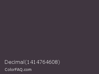 Decimal 1414764608 Color is a dark magenta color and the nearest color is Ship Gray #3e3a44. Hex code #403640 and RGB value is rgb(64,54,64). In RGB color space, this color is composed of 25% red, 21% green, 25% blue, In CMYK color space, this color is composed of 0% cyan, 16% magenta, 0% yellow , 75% black , In HSL color space, this color has a hue angle of 300° , 8% saturation and 23% lightness.