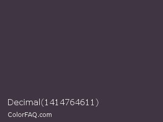 Decimal 1414764611 Color is a dark purple color and the nearest color is Ship Gray #3e3a44. Hex code #403643 and RGB value is rgb(64,54,67). In RGB color space, this color is composed of 25% red, 21% green, 26% blue, In CMYK color space, this color is composed of 4% cyan, 19% magenta, 0% yellow , 74% black , In HSL color space, this color has a hue angle of 286° , 11% saturation and 24% lightness.