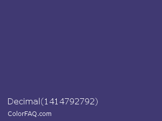 Decimal 1414792792 Color is a normal indigo color and the nearest color is Minsk #3f307f. Hex code #403972 and RGB value is rgb(64,57,114). In RGB color space, this color is composed of 25% red, 22% green, 45% blue, In CMYK color space, this color is composed of 44% cyan, 50% magenta, 0% yellow , 55% black , In HSL color space, this color has a hue angle of 247° , 33% saturation and 34% lightness.