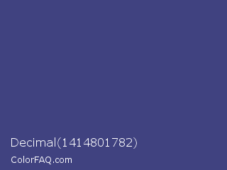 Decimal 1414801782 Color is a normal blue color and the nearest color is East Bay #414c7d. Hex code #404280 and RGB value is rgb(64,66,128). In RGB color space, this color is composed of 25% red, 26% green, 50% blue, In CMYK color space, this color is composed of 50% cyan, 48% magenta, 0% yellow , 50% black , In HSL color space, this color has a hue angle of 238° , 33% saturation and 38% lightness.