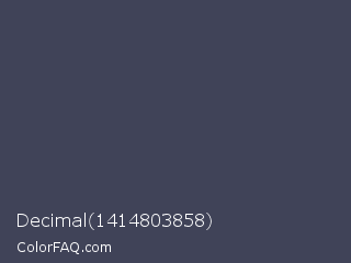 Decimal 1414803858 Color is a dark blue color and the nearest color is Gun Powder #414257. Hex code #404358 and RGB value is rgb(64,67,88). In RGB color space, this color is composed of 25% red, 26% green, 35% blue, In CMYK color space, this color is composed of 27% cyan, 24% magenta, 0% yellow , 65% black , In HSL color space, this color has a hue angle of 233° , 16% saturation and 30% lightness.