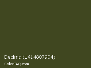 Decimal 1414807904 Color is a very dark lime color and the nearest color is Thatch Green #403d19. Hex code #404720 and RGB value is rgb(64,71,32). In RGB color space, this color is composed of 25% red, 28% green, 13% blue, In CMYK color space, this color is composed of 10% cyan, 0% magenta, 55% yellow , 72% black , In HSL color space, this color has a hue angle of 71° , 38% saturation and 20% lightness.