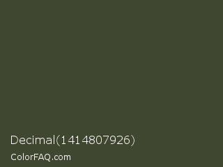 Decimal 1414807926 Color is a dark lime color and the nearest color is Kelp #454936. Hex code #404730 and RGB value is rgb(64,71,48). In RGB color space, this color is composed of 25% red, 28% green, 19% blue, In CMYK color space, this color is composed of 10% cyan, 0% magenta, 32% yellow , 72% black , In HSL color space, this color has a hue angle of 78° , 19% saturation and 23% lightness.