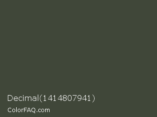 Decimal 1414807941 Color is a dark green color and the nearest color is Lunar Green #3c493a. Hex code #404739 and RGB value is rgb(64,71,57). In RGB color space, this color is composed of 25% red, 28% green, 22% blue, In CMYK color space, this color is composed of 10% cyan, 0% magenta, 20% yellow , 72% black , In HSL color space, this color has a hue angle of 90° , 11% saturation and 25% lightness.