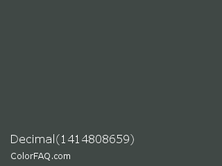 Decimal 1414808659 Color is a dark green color and the nearest color is Cape Cod #3c4443. Hex code #404845 and RGB value is rgb(64,72,69). In RGB color space, this color is composed of 25% red, 28% green, 27% blue, In CMYK color space, this color is composed of 11% cyan, 0% magenta, 4% yellow , 72% black , In HSL color space, this color has a hue angle of 158° , 6% saturation and 27% lightness.