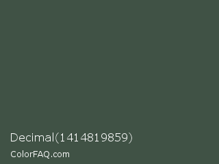 Decimal 1414819859 Color is a dark green color and the nearest color is Gray Asparagus #465945. Hex code #405245 and RGB value is rgb(64,82,69). In RGB color space, this color is composed of 25% red, 32% green, 27% blue, In CMYK color space, this color is composed of 22% cyan, 0% magenta, 16% yellow , 68% black , In HSL color space, this color has a hue angle of 137° , 12% saturation and 29% lightness.