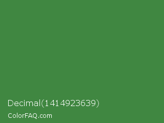Decimal 1414923639 Color is a normal green color and the nearest color is May Green #4c9141. Hex code #408741 and RGB value is rgb(64,135,65). In RGB color space, this color is composed of 25% red, 53% green, 25% blue, In CMYK color space, this color is composed of 53% cyan, 0% magenta, 52% yellow , 47% black , In HSL color space, this color has a hue angle of 121° , 36% saturation and 39% lightness.