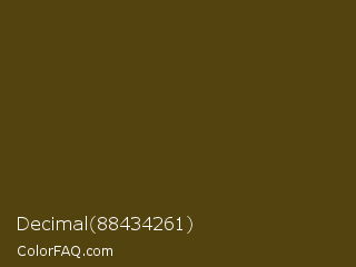 Decimal 88434261 Color is a very dark yellow color and the nearest color is Bronze Olive #4e420c. Hex code #53430f and RGB value is rgb(83,67,15). In RGB color space, this color is composed of 33% red, 26% green, 6% blue, In CMYK color space, this color is composed of 0% cyan, 19% magenta, 82% yellow , 67% black , In HSL color space, this color has a hue angle of 46° , 69% saturation and 19% lightness.