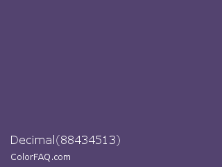 Decimal 88434513 Color is a normal violet color and the nearest color is Cyber Grape #58427c. Hex code #53436f and RGB value is rgb(83,67,111). In RGB color space, this color is composed of 33% red, 26% green, 44% blue, In CMYK color space, this color is composed of 25% cyan, 40% magenta, 0% yellow , 56% black , In HSL color space, this color has a hue angle of 262° , 25% saturation and 35% lightness.