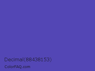 Decimal 88438153 Color is a normal indigo color and the nearest color is Ocean Blue #4f42b5. Hex code #5346b5 and RGB value is rgb(83,70,181). In RGB color space, this color is composed of 33% red, 27% green, 71% blue, In CMYK color space, this color is composed of 54% cyan, 61% magenta, 0% yellow , 29% black , In HSL color space, this color has a hue angle of 247° , 44% saturation and 49% lightness.