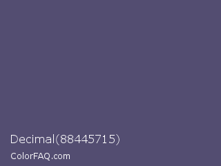 Decimal 88445715 Color is a normal indigo color and the nearest color is Independence #4c516d. Hex code #534d71 and RGB value is rgb(83,77,113). In RGB color space, this color is composed of 33% red, 30% green, 44% blue, In CMYK color space, this color is composed of 27% cyan, 32% magenta, 0% yellow , 56% black , In HSL color space, this color has a hue angle of 250° , 19% saturation and 37% lightness.