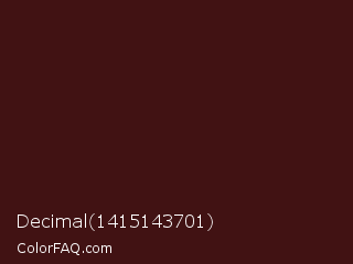 Decimal 1415143701 Color is a very dark red color and the nearest color is Dark Sienna #3c1414. Hex code #411213 and RGB value is rgb(65,18,19). In RGB color space, this color is composed of 25% red, 7% green, 7% blue, In CMYK color space, this color is composed of 0% cyan, 72% magenta, 71% yellow , 75% black , In HSL color space, this color has a hue angle of 359° , 57% saturation and 16% lightness.