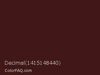 Decimal 1415148440 Color is a very dark red color and the nearest color is Dark Sienna #3c1414. Hex code #411716 and RGB value is rgb(65,23,22). In RGB color space, this color is composed of 25% red, 9% green, 9% blue, In CMYK color space, this color is composed of 0% cyan, 65% magenta, 66% yellow , 75% black , In HSL color space, this color has a hue angle of 1° , 49% saturation and 17% lightness.