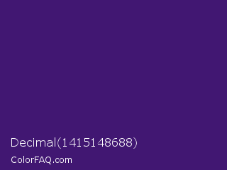Decimal 1415148688 Color is a dark violet color and the nearest color is Meteorite #3c1f76. Hex code #411772 and RGB value is rgb(65,23,114). In RGB color space, this color is composed of 25% red, 9% green, 45% blue, In CMYK color space, this color is composed of 43% cyan, 80% magenta, 0% yellow , 55% black , In HSL color space, this color has a hue angle of 268° , 66% saturation and 27% lightness.