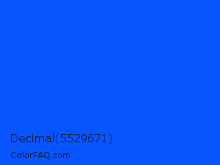 Decimal 5529671 Color is a normal blue color and the nearest color is Blue RYB #0247fe. Hex code #0854ff and RGB value is rgb(8,84,255). In RGB color space, this color is composed of 3% red, 33% green, 100% blue, In CMYK color space, this color is composed of 97% cyan, 67% magenta, 0% yellow , 0% black , In HSL color space, this color has a hue angle of 222° , 100% saturation and 52% lightness.