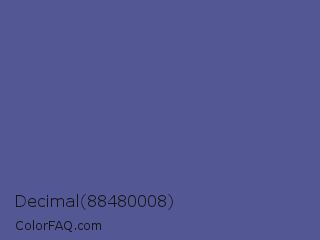 Decimal 88480008 Color is a normal blue color and the nearest color is UCLA Blue #536895. Hex code #535794 and RGB value is rgb(83,87,148). In RGB color space, this color is composed of 33% red, 34% green, 58% blue, In CMYK color space, this color is composed of 44% cyan, 41% magenta, 0% yellow , 42% black , In HSL color space, this color has a hue angle of 236° , 28% saturation and 45% lightness.