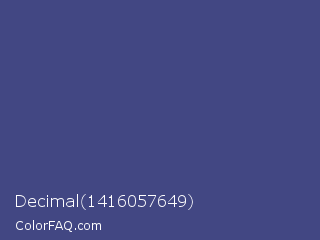 Decimal 1416057649 Color is a normal blue color and the nearest color is East Bay #414c7d. Hex code #424783 and RGB value is rgb(66,71,131). In RGB color space, this color is composed of 26% red, 28% green, 51% blue, In CMYK color space, this color is composed of 50% cyan, 46% magenta, 0% yellow , 49% black , In HSL color space, this color has a hue angle of 235° , 33% saturation and 39% lightness.