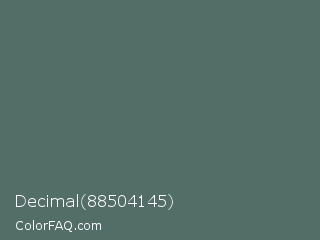 Decimal 88504145 Color is a normal cyan color and the nearest color is Stormcloud #4f666a. Hex code #536e67 and RGB value is rgb(83,110,103). In RGB color space, this color is composed of 33% red, 43% green, 40% blue, In CMYK color space, this color is composed of 25% cyan, 0% magenta, 6% yellow , 57% black , In HSL color space, this color has a hue angle of 164° , 14% saturation and 38% lightness.