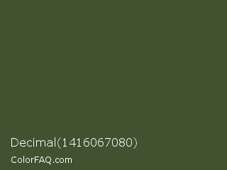 Decimal 1416067080 Color is a dark green color and the nearest color is Rifle Green #444c38. Hex code #425130 and RGB value is rgb(66,81,48). In RGB color space, this color is composed of 26% red, 32% green, 19% blue, In CMYK color space, this color is composed of 19% cyan, 0% magenta, 41% yellow , 68% black , In HSL color space, this color has a hue angle of 87° , 26% saturation and 25% lightness.