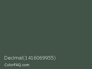Decimal 1416069955 Color is a dark green color and the nearest color is Gray Asparagus #465945. Hex code #425347 and RGB value is rgb(66,83,71). In RGB color space, this color is composed of 26% red, 33% green, 28% blue, In CMYK color space, this color is composed of 20% cyan, 0% magenta, 14% yellow , 67% black , In HSL color space, this color has a hue angle of 138° , 11% saturation and 29% lightness.