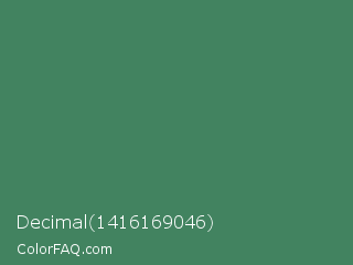 Decimal 1416169046 Color is a normal green color and the nearest color is Viridian #40826d. Hex code #428360 and RGB value is rgb(66,131,96). In RGB color space, this color is composed of 26% red, 51% green, 38% blue, In CMYK color space, this color is composed of 50% cyan, 0% magenta, 27% yellow , 49% black , In HSL color space, this color has a hue angle of 148° , 33% saturation and 39% lightness.