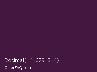 Decimal 1416791314 Color is a very dark magenta color and the nearest color is Loulou #460b41. Hex code #431740 and RGB value is rgb(67,23,64). In RGB color space, this color is composed of 26% red, 9% green, 25% blue, In CMYK color space, this color is composed of 0% cyan, 66% magenta, 4% yellow , 74% black , In HSL color space, this color has a hue angle of 304° , 49% saturation and 18% lightness.