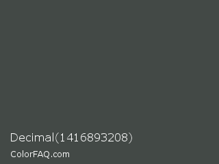 Decimal 1416893208 Color is a dark green color and the nearest color is Outer Space #414a4c. Hex code #434946 and RGB value is rgb(67,73,70). In RGB color space, this color is composed of 26% red, 29% green, 27% blue, In CMYK color space, this color is composed of 8% cyan, 0% magenta, 4% yellow , 71% black , In HSL color space, this color has a hue angle of 150° , 4% saturation and 27% lightness.