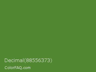 Decimal 88556373 Color is a normal green color and the nearest color is Maximum Green #5e8c31. Hex code #538833 and RGB value is rgb(83,136,51). In RGB color space, this color is composed of 33% red, 53% green, 20% blue, In CMYK color space, this color is composed of 39% cyan, 0% magenta, 63% yellow , 47% black , In HSL color space, this color has a hue angle of 97° , 45% saturation and 37% lightness.